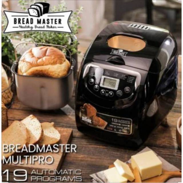 Garansi 1 tahunBreadmaster Multipro inovasi baru breadmaster. Alat pembuat roti, cake dan aneka hidangan lainnya. Dilengkapi dengan teknologi yang memudahkan untuk membuat roti dengan sekejap. Pilihat alat yang mudah untuk menciptakan kreasi roti bahkan untuk pemula dengan 19 program otomatis menjadi semakin mudah untuk berkreasi.Solusi mudah tanpa perlu alat banyak untuk membuat roti, tanpa oven, tanpa mixer, tanpa alat fermentasi, semuanya lengkap dalam 1 set Breadmaster Multipro.KEUNGGULAN PRODUK :Program digital dengan tampilan tombol LCD yang mudah dioperasikan19 Program Menu OtomatisFitur pengatur warna kematangan roti yang dapat diukut dengan 3 pilihan, light, medium, darkFitur pengatur tunda waktu, fitur tombol tunda program jika tidak ingin roti diproses secara langsungFitur pengatur berat, pilihan berat yang sesuai dengan kebutuhan (500gr, 750gr, 1000gr)Roti akan tetap hangat selama 60 menit setelah matangDilengkapi dengan buku resep praktis yang memudahkan pemula untuk membuat rotiSPESIFIKASI PRODUK :Material : Black stainless steel body, tempered glass lid top, glass viewing window, aluminum alloy bread pan and aluminum die casting mixing blade (non stick coated)Daya Listrik : 600WKapasitas loyang : 1 literWarna : HitamDimensi Produk : 33.5 x 27.2 x 31 cmGaransi : 1 TahunISI PAKETAN :1 Main Unit1 Loyang Roti1 Mata Pengaduk1 Gelas takar 240ml1 Sendok Takar1 Pengait/kait mata pengaduk1 Buku R