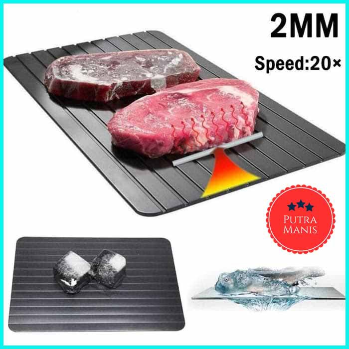 Mo Masak Tapi Daging masih beku?keburu koma tunggu masakan jadipakai ini hemat waktu untuk cepat daging kembali kesuhu awal :DTidak perlu menunggu waktu lama mencairkan makanan beku,[merendam makanan beku dalam air agar cepat cair, akan mengurangi rasa makanan tersebut]Tinggalkan cara lama, dan beralih pada produk INOVATIP ''" NEW DEFROSTING TRAY.Hadir NEW DEFROSTING TRAY yang berkerja sangat cepat, efisien dan AMAN (FOOD GRADE) untuk mencairkan makanan/daging beku hanya dalam beberapa menit saja sudah cair.DEFROSTING TRAY terbuat dari bahan konduktif termal berkualitas tinggi utk mempercepat proses pencairan.DEFROSTING TRAY TIDAK MENGGUNAKAN LISTRIK atau BATERAI, makanan BEKU akan SEGERA CAIR secara ALAMI dalam waktu beberapa menit* Berat : 425 Gram* 1 Kg muat 3 pcs* Size : 29,5 x 21,8 x 0,2 Cm* Bahan : aluminium [KOKOH - TIDAK MUDAH MELENGKUNG]- coating tidak mudah ngelupas, tahan panas sampai 360 derajat Celsius- NON STICKBahan makanan beku seperti daging sapi, ayam, seafood, dan sebagainya bakal lebih mudah mencair bila Anda menggunakan talenan unik defrosting ini. Bahkan tak perlu menggunakan baterai, air panas, atau bantuan microwave. Cukup taruh saja daging di atas alat tersebut, dan tunggu hingga daging beku mencair.Notes: Hanya mendapat satu buah talenanTalenan ini memanfaatkan konduktivitas panas dari logam khusus yang membuatnya mampu mencairkan daging dengan cara alami, tanpa bantuan listrik, suhu panas, dan sebagainya.Selain digunakan sebagai defrost, alat ini bisa sebagai tatakan atau talenan untuk bahan masakan lainnya seperti daging ayam, buah, dan sayuran.Defrosting ini terbuat dari bahan aluminium yang begitu aman dan tidak berbahaya untuk bahan makanan Anda.Cukup taruh saja daging di atas alat tersebut, dan tunggu hingga 30-60 menit tergantung ketebalan dag