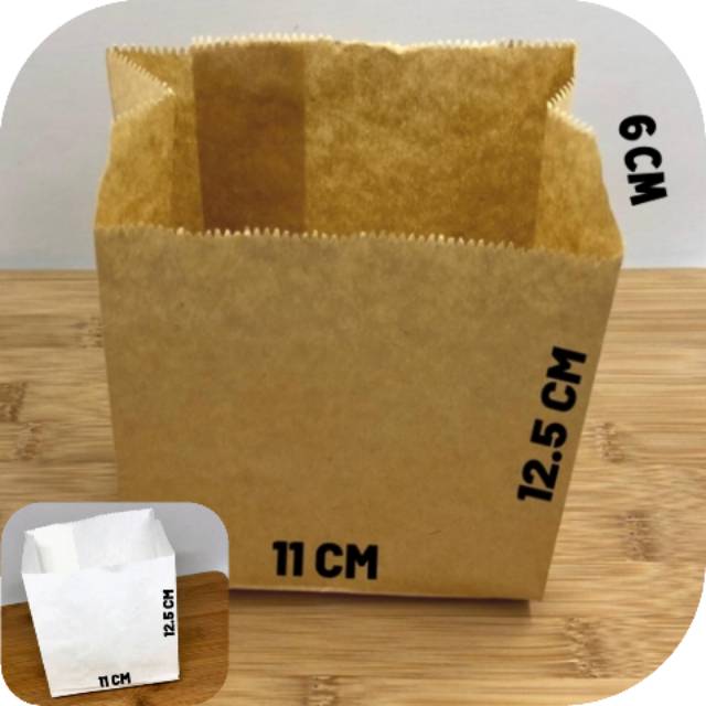 Harga tertera untuk 100 lembar. Tersedia 2 warna:-Putih-CokelatTersedia 4 ukuran saat dibuka (tinggi x panjang x lebar) :- 11cm x 10,5cm x 3cm (kecil)- 12,5cm x 11cm x 6cm (kecil+)- 19,5cm x 12,5cm x 8cm (sedang)- 27cm x 19,5cm x 10cm (besar)(untuk yg ukuran kecil, sedang, besar tanyakan lewat chat ya kak)Paper bag kecil+ / atau kantong kertas ini terbuat dari material kertas greaseproof.Kertas greaseproof adalah kertas "food grade" yang tidak bisa ditembus oleh minyak dan sering digunakan sebagai pembungkus makanan siap saji ( fast food ) seperti roti, donat, fried chicken, kentang goreng, snack dan juga sering kita jumpai sebagai pembungkus permen.kertas greaseproof tidak berbahaya bahkan jika bersentuhan dengan mak