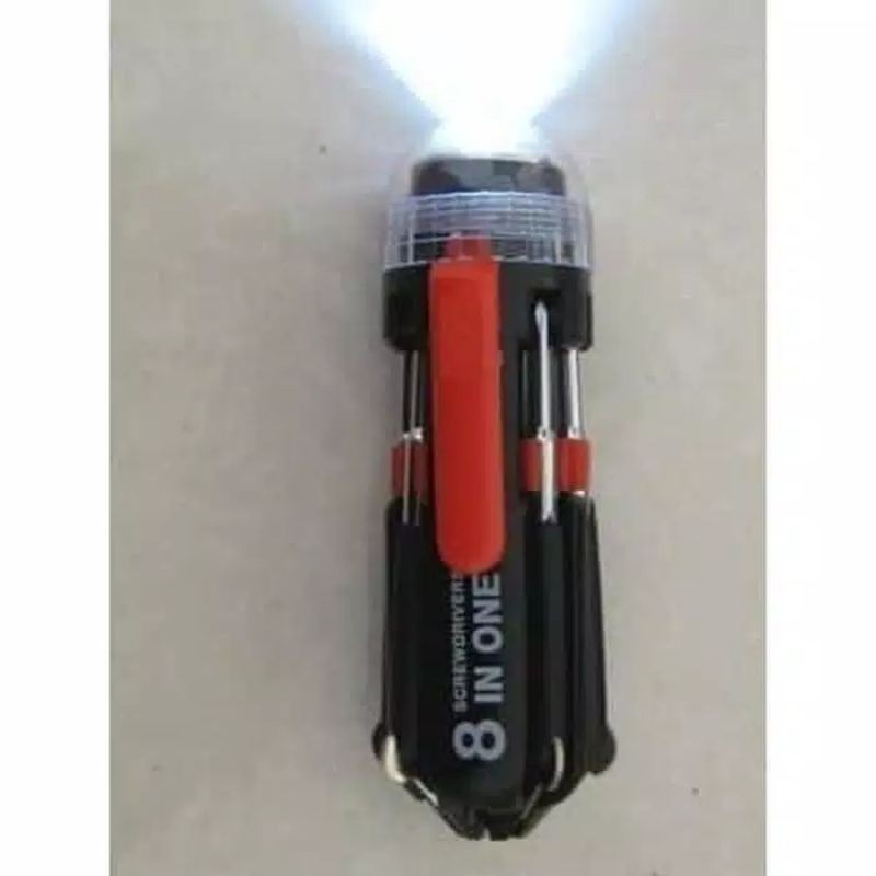 Obeng 8in1 Multifungsi / Obeng 8in1 Lampu LedAnda sering kesal karena beberapa jenis obeng anda sering hilang / tercecer ???Anda sering kesal saat melakukan aktivitas pertukangan seperti membuka baut tiba2 lampu mati ?Ataupun anda biasa bekerja ditempat gelap karena tuntutan profesi ?Telah Hadir !!!Obeng Multifungsi dilengkapi dengan 7 Jenis Obeng berbagai ukuran disertai dengan Lampu Sinar yang Terang Benderang !!Kegunaan :1. Memiliki 7 Jenis Obeng dari yang Besar sampe yang Terkecil dan ber-Magnet sehingga memudahkan sekali untuk pengerjaan pada sekrup kecil.2. Pekerjaan Rumah tidak Repot lagi, tidak perlu mencari-cari Obeng dengan jenis tertentu, cukup 1 alat semua teratasi.3. Memiliki Lampu Sinar yang terang benderang sehingga memudahkan pengerjaan di sudut sempit, gelap dan pada saat Listrik Mati, sangat membantu.4. Kuat dan Kokoh tidak gampang Rusak !!5. Bentuknya Simple, Handy dan Praktis, mudah untuk dibawa kemanapun (Persiapan saat Berkendara, di Rumah, di Kantor dll)Spesifikasi Produk :1. Menggunakan batery AAA - 3 pcs untuk lampu senter ( flash light ) - Belum trmasuk2. Handle Material dari ABS3. Material Obeng terbuat dari baja4. dilengkapi dengan kotak untuk pakingnya5. Warna hitam - Merah6. Ukuran : 8cm x 4.8cm x 14cmBarang tidak bergar