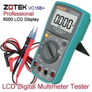 MULTITESTER ZOTEK ZT-15B+ ORIGINALDeskripsi:ZOTEK VC15B+ auto-ranging digital multimeter using double-integral style A/D transform as the core, can be used to measures AC/DC voltage, AC/DC current, resistance, capacitance, Diode and continuity testing, temperature, frequency and etc. It is characterized by stable function and high reliability, with the features of overload protection and LCD display for clear reading. It is an ideal tool for lab, factory, radio fans and family use.Auto ranges functionTrue RMS measurement550V protection in resistance and capacitance rangesLarge LCD display with backlight, display 6000 counts (max.)Sample rate: 3 times per secondPolarity identificationLow voltage indication20A high current measurement is availableAuto power offMain measurements: AC/DC Voltage, AC/DC current, resistance, capacitance, diode and continuity testing, frequency and duty cycle-Frequency: 1Hz to 20MHz-Capacitance :10pF to 6000uF-AC volts: 0.1mV to 750V-DC volts: 0.1mV to 1000V-AC current: 0.1uA to 20A-DC current: 0.1uA to 20A-Resistance: 0.1Ω to 60MΩ-Duty cycle: 1% to 99%Specifications:Frequency: 5/50/500/5k/50k/500k/5M/20M (±0.1+3)Capacitance: 10nF(±5.0+20), 100nF/1uF/10uF/100uF(±2.0%+5), 1000uF/10000uF(±5.0%+5)DC volt: 600mV(±1.0%+10), 6V/60V/600V/1000V(±0.5%+3)AC volt: 600mV(±3.0%+3), 6V/60V/600V/750V(±1.0%+3)ACA/DCA: 600uA/6000uA(±1.5%+3), 60mA/600mA/20A(±1.5%+3)Resistance: 600Ω(±0.5%+3), 6K/60K/600K/6M(±0.5%+2), 60MΩ(±1.5%+3)Duty cycle: 1% to 99%(±1%)Measurement mode: Double-integral style A/D transformOver range indication: OLWorking environment: 0~40°C, relative humidity: < 80%Supply power: 3V (1.5V AA batteries * 2 Pcs)Dimension: 180*90.5*45mmPackage included:1 * Digital Multimeter.1 * Table pen2 * AA batteries1 * Manual